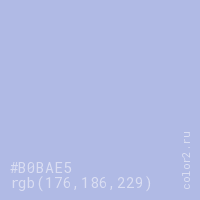Цвет #B0BAE5 в цветовой модели RGB обозначается тремя октетами (176, 186, 229) в десятичном формате и #B0BAE5 в шестнадцатиричном (hex) формате, которые являются интенсивностью красного 176 (hex B0), интенсивность зелёного 186 (hex BA) и интенсивность синего 229 (hex E5).