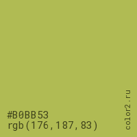 Цвет #B0BB53 в цветовой модели RGB обозначается тремя октетами (176, 187, 83) в десятичном формате и #B0BB53 в шестнадцатиричном (hex) формате, которые являются интенсивностью красного 176 (hex B0), интенсивность зелёного 187 (hex BB) и интенсивность синего 83 (hex 53).