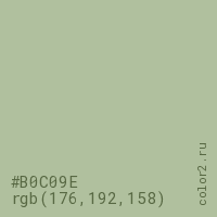 Цвет #B0C09E в цветовой модели RGB обозначается тремя октетами (176, 192, 158) в десятичном формате и #B0C09E в шестнадцатиричном (hex) формате, которые являются интенсивностью красного 176 (hex B0), интенсивность зелёного 192 (hex C0) и интенсивность синего 158 (hex 9E).