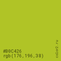Цвет #B0C426 в цветовой модели RGB обозначается тремя октетами (176, 196, 38) в десятичном формате и #B0C426 в шестнадцатиричном (hex) формате, которые являются интенсивностью красного 176 (hex B0), интенсивность зелёного 196 (hex C4) и интенсивность синего 38 (hex 26).
