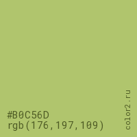 Цвет #B0C56D в цветовой модели RGB обозначается тремя октетами (176, 197, 109) в десятичном формате и #B0C56D в шестнадцатиричном (hex) формате, которые являются интенсивностью красного 176 (hex B0), интенсивность зелёного 197 (hex C5) и интенсивность синего 109 (hex 6D).