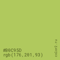 Цвет #B0C95D в цветовой модели RGB обозначается тремя октетами (176, 201, 93) в десятичном формате и #B0C95D в шестнадцатиричном (hex) формате, которые являются интенсивностью красного 176 (hex B0), интенсивность зелёного 201 (hex C9) и интенсивность синего 93 (hex 5D).