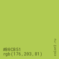 Цвет #B0CB51 в цветовой модели RGB обозначается тремя октетами (176, 203, 81) в десятичном формате и #B0CB51 в шестнадцатиричном (hex) формате, которые являются интенсивностью красного 176 (hex B0), интенсивность зелёного 203 (hex CB) и интенсивность синего 81 (hex 51).