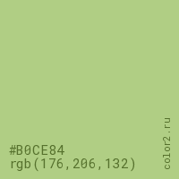 Цвет #B0CE84 в цветовой модели RGB обозначается тремя октетами (176, 206, 132) в десятичном формате и #B0CE84 в шестнадцатиричном (hex) формате, которые являются интенсивностью красного 176 (hex B0), интенсивность зелёного 206 (hex CE) и интенсивность синего 132 (hex 84).