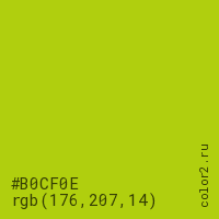 Цвет #B0CF0E в цветовой модели RGB обозначается тремя октетами (176, 207, 14) в десятичном формате и #B0CF0E в шестнадцатиричном (hex) формате, которые являются интенсивностью красного 176 (hex B0), интенсивность зелёного 207 (hex CF) и интенсивность синего 14 (hex 0E).