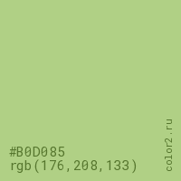 Цвет #B0D085 в цветовой модели RGB обозначается тремя октетами (176, 208, 133) в десятичном формате и #B0D085 в шестнадцатиричном (hex) формате, которые являются интенсивностью красного 176 (hex B0), интенсивность зелёного 208 (hex D0) и интенсивность синего 133 (hex 85).