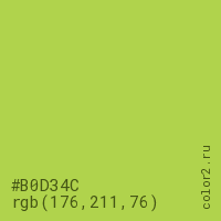 Цвет #B0D34C в цветовой модели RGB обозначается тремя октетами (176, 211, 76) в десятичном формате и #B0D34C в шестнадцатиричном (hex) формате, которые являются интенсивностью красного 176 (hex B0), интенсивность зелёного 211 (hex D3) и интенсивность синего 76 (hex 4C).