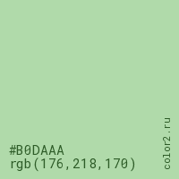 Цвет #B0DAAA в цветовой модели RGB обозначается тремя октетами (176, 218, 170) в десятичном формате и #B0DAAA в шестнадцатиричном (hex) формате, которые являются интенсивностью красного 176 (hex B0), интенсивность зелёного 218 (hex DA) и интенсивность синего 170 (hex AA).