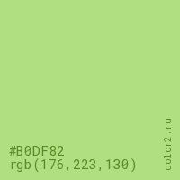 Цвет #B0DF82 в цветовой модели RGB обозначается тремя октетами (176, 223, 130) в десятичном формате и #B0DF82 в шестнадцатиричном (hex) формате, которые являются интенсивностью красного 176 (hex B0), интенсивность зелёного 223 (hex DF) и интенсивность синего 130 (hex 82).