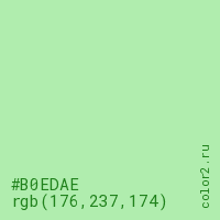 Цвет #B0EDAE в цветовой модели RGB обозначается тремя октетами (176, 237, 174) в десятичном формате и #B0EDAE в шестнадцатиричном (hex) формате, которые являются интенсивностью красного 176 (hex B0), интенсивность зелёного 237 (hex ED) и интенсивность синего 174 (hex AE).
