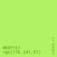 Цвет #B0F161 в цветовой модели RGB обозначается тремя октетами (176, 241, 97) в десятичном формате и #B0F161 в шестнадцатиричном (hex) формате, которые являются интенсивностью красного 176 (hex B0), интенсивность зелёного 241 (hex F1) и интенсивность синего 97 (hex 61).