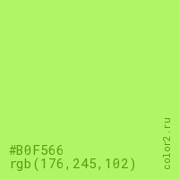 Цвет #B0F566 в цветовой модели RGB обозначается тремя октетами (176, 245, 102) в десятичном формате и #B0F566 в шестнадцатиричном (hex) формате, которые являются интенсивностью красного 176 (hex B0), интенсивность зелёного 245 (hex F5) и интенсивность синего 102 (hex 66).