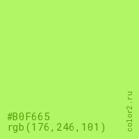 Цвет #B0F665 в цветовой модели RGB обозначается тремя октетами (176, 246, 101) в десятичном формате и #B0F665 в шестнадцатиричном (hex) формате, которые являются интенсивностью красного 176 (hex B0), интенсивность зелёного 246 (hex F6) и интенсивность синего 101 (hex 65).