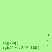Цвет #B0F999 в цветовой модели RGB обозначается тремя октетами (176, 249, 153) в десятичном формате и #B0F999 в шестнадцатиричном (hex) формате, которые являются интенсивностью красного 176 (hex B0), интенсивность зелёного 249 (hex F9) и интенсивность синего 153 (hex 99).