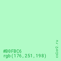Цвет #B0FBC6 в цветовой модели RGB обозначается тремя октетами (176, 251, 198) в десятичном формате и #B0FBC6 в шестнадцатиричном (hex) формате, которые являются интенсивностью красного 176 (hex B0), интенсивность зелёного 251 (hex FB) и интенсивность синего 198 (hex C6).