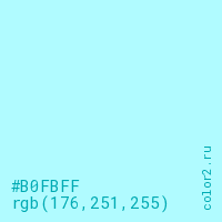 Цвет #B0FBFF в цветовой модели RGB обозначается тремя октетами (176, 251, 255) в десятичном формате и #B0FBFF в шестнадцатиричном (hex) формате, которые являются интенсивностью красного 176 (hex B0), интенсивность зелёного 251 (hex FB) и интенсивность синего 255 (hex FF).