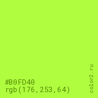 Цвет #B0FD40 в цветовой модели RGB обозначается тремя октетами (176, 253, 64) в десятичном формате и #B0FD40 в шестнадцатиричном (hex) формате, которые являются интенсивностью красного 176 (hex B0), интенсивность зелёного 253 (hex FD) и интенсивность синего 64 (hex 40).