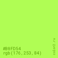 Цвет #B0FD54 в цветовой модели RGB обозначается тремя октетами (176, 253, 84) в десятичном формате и #B0FD54 в шестнадцатиричном (hex) формате, которые являются интенсивностью красного 176 (hex B0), интенсивность зелёного 253 (hex FD) и интенсивность синего 84 (hex 54).