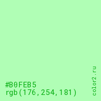 Цвет #B0FEB5 в цветовой модели RGB обозначается тремя октетами (176, 254, 181) в десятичном формате и #B0FEB5 в шестнадцатиричном (hex) формате, которые являются интенсивностью красного 176 (hex B0), интенсивность зелёного 254 (hex FE) и интенсивность синего 181 (hex B5).