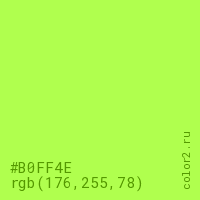 Цвет #B0FF4E в цветовой модели RGB обозначается тремя октетами (176, 255, 78) в десятичном формате и #B0FF4E в шестнадцатиричном (hex) формате, которые являются интенсивностью красного 176 (hex B0), интенсивность зелёного 255 (hex FF) и интенсивность синего 78 (hex 4E).