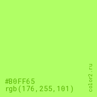 Цвет #B0FF65 в цветовой модели RGB обозначается тремя октетами (176, 255, 101) в десятичном формате и #B0FF65 в шестнадцатиричном (hex) формате, которые являются интенсивностью красного 176 (hex B0), интенсивность зелёного 255 (hex FF) и интенсивность синего 101 (hex 65).