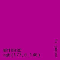 Цвет #B1008C в цветовой модели RGB обозначается тремя октетами (177, 0, 140) в десятичном формате и #B1008C в шестнадцатиричном (hex) формате, которые являются интенсивностью красного 177 (hex B1), интенсивность зелёного 0 (hex 00) и интенсивность синего 140 (hex 8C).