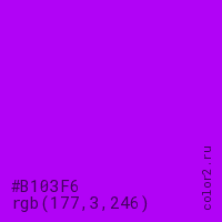 Цвет #B103F6 в цветовой модели RGB обозначается тремя октетами (177, 3, 246) в десятичном формате и #B103F6 в шестнадцатиричном (hex) формате, которые являются интенсивностью красного 177 (hex B1), интенсивность зелёного 3 (hex 03) и интенсивность синего 246 (hex F6).