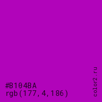 Цвет #B104BA в цветовой модели RGB обозначается тремя октетами (177, 4, 186) в десятичном формате и #B104BA в шестнадцатиричном (hex) формате, которые являются интенсивностью красного 177 (hex B1), интенсивность зелёного 4 (hex 04) и интенсивность синего 186 (hex BA).