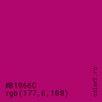 Цвет #B1066C в цветовой модели RGB обозначается тремя октетами (177, 6, 108) в десятичном формате и #B1066C в шестнадцатиричном (hex) формате, которые являются интенсивностью красного 177 (hex B1), интенсивность зелёного 6 (hex 06) и интенсивность синего 108 (hex 6C).