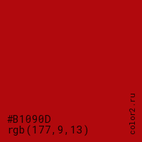 Цвет #B1090D в цветовой модели RGB обозначается тремя октетами (177, 9, 13) в десятичном формате и #B1090D в шестнадцатиричном (hex) формате, которые являются интенсивностью красного 177 (hex B1), интенсивность зелёного 9 (hex 09) и интенсивность синего 13 (hex 0D).