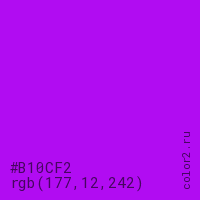 Цвет #B10CF2 в цветовой модели RGB обозначается тремя октетами (177, 12, 242) в десятичном формате и #B10CF2 в шестнадцатиричном (hex) формате, которые являются интенсивностью красного 177 (hex B1), интенсивность зелёного 12 (hex 0C) и интенсивность синего 242 (hex F2).