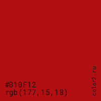 Цвет #B10F12 в цветовой модели RGB обозначается тремя октетами (177, 15, 18) в десятичном формате и #B10F12 в шестнадцатиричном (hex) формате, которые являются интенсивностью красного 177 (hex B1), интенсивность зелёного 15 (hex 0F) и интенсивность синего 18 (hex 12).