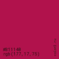 Цвет #B1114B в цветовой модели RGB обозначается тремя октетами (177, 17, 75) в десятичном формате и #B1114B в шестнадцатиричном (hex) формате, которые являются интенсивностью красного 177 (hex B1), интенсивность зелёного 17 (hex 11) и интенсивность синего 75 (hex 4B).