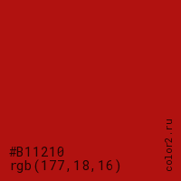 Цвет #B11210 в цветовой модели RGB обозначается тремя октетами (177, 18, 16) в десятичном формате и #B11210 в шестнадцатиричном (hex) формате, которые являются интенсивностью красного 177 (hex B1), интенсивность зелёного 18 (hex 12) и интенсивность синего 16 (hex 10).