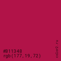 Цвет #B11348 в цветовой модели RGB обозначается тремя октетами (177, 19, 72) в десятичном формате и #B11348 в шестнадцатиричном (hex) формате, которые являются интенсивностью красного 177 (hex B1), интенсивность зелёного 19 (hex 13) и интенсивность синего 72 (hex 48).