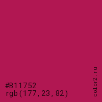 Цвет #B11752 в цветовой модели RGB обозначается тремя октетами (177, 23, 82) в десятичном формате и #B11752 в шестнадцатиричном (hex) формате, которые являются интенсивностью красного 177 (hex B1), интенсивность зелёного 23 (hex 17) и интенсивность синего 82 (hex 52).