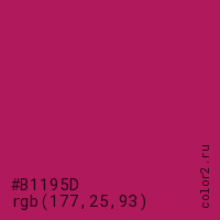 Цвет #B1195D в цветовой модели RGB обозначается тремя октетами (177, 25, 93) в десятичном формате и #B1195D в шестнадцатиричном (hex) формате, которые являются интенсивностью красного 177 (hex B1), интенсивность зелёного 25 (hex 19) и интенсивность синего 93 (hex 5D).