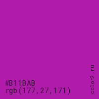 Цвет #B11BAB в цветовой модели RGB обозначается тремя октетами (177, 27, 171) в десятичном формате и #B11BAB в шестнадцатиричном (hex) формате, которые являются интенсивностью красного 177 (hex B1), интенсивность зелёного 27 (hex 1B) и интенсивность синего 171 (hex AB).