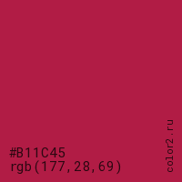 Цвет #B11C45 в цветовой модели RGB обозначается тремя октетами (177, 28, 69) в десятичном формате и #B11C45 в шестнадцатиричном (hex) формате, которые являются интенсивностью красного 177 (hex B1), интенсивность зелёного 28 (hex 1C) и интенсивность синего 69 (hex 45).