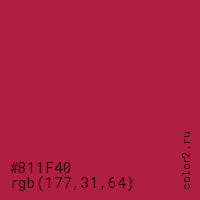 Цвет #B11F40 в цветовой модели RGB обозначается тремя октетами (177, 31, 64) в десятичном формате и #B11F40 в шестнадцатиричном (hex) формате, которые являются интенсивностью красного 177 (hex B1), интенсивность зелёного 31 (hex 1F) и интенсивность синего 64 (hex 40).
