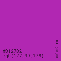 Цвет #B127B2 в цветовой модели RGB обозначается тремя октетами (177, 39, 178) в десятичном формате и #B127B2 в шестнадцатиричном (hex) формате, которые являются интенсивностью красного 177 (hex B1), интенсивность зелёного 39 (hex 27) и интенсивность синего 178 (hex B2).