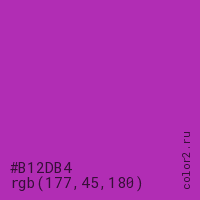 Цвет #B12DB4 в цветовой модели RGB обозначается тремя октетами (177, 45, 180) в десятичном формате и #B12DB4 в шестнадцатиричном (hex) формате, которые являются интенсивностью красного 177 (hex B1), интенсивность зелёного 45 (hex 2D) и интенсивность синего 180 (hex B4).