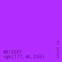 Цвет #B12EFF в цветовой модели RGB обозначается тремя октетами (177, 46, 255) в десятичном формате и #B12EFF в шестнадцатиричном (hex) формате, которые являются интенсивностью красного 177 (hex B1), интенсивность зелёного 46 (hex 2E) и интенсивность синего 255 (hex FF).