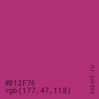 Цвет #B12F76 в цветовой модели RGB обозначается тремя октетами (177, 47, 118) в десятичном формате и #B12F76 в шестнадцатиричном (hex) формате, которые являются интенсивностью красного 177 (hex B1), интенсивность зелёного 47 (hex 2F) и интенсивность синего 118 (hex 76).