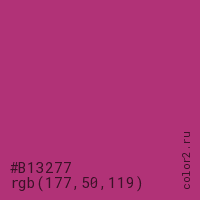 Цвет #B13277 в цветовой модели RGB обозначается тремя октетами (177, 50, 119) в десятичном формате и #B13277 в шестнадцатиричном (hex) формате, которые являются интенсивностью красного 177 (hex B1), интенсивность зелёного 50 (hex 32) и интенсивность синего 119 (hex 77).