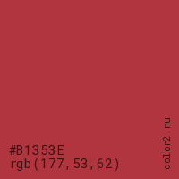 Цвет #B1353E в цветовой модели RGB обозначается тремя октетами (177, 53, 62) в десятичном формате и #B1353E в шестнадцатиричном (hex) формате, которые являются интенсивностью красного 177 (hex B1), интенсивность зелёного 53 (hex 35) и интенсивность синего 62 (hex 3E).