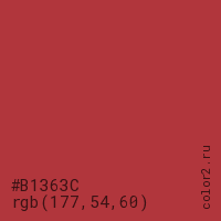 Цвет #B1363C в цветовой модели RGB обозначается тремя октетами (177, 54, 60) в десятичном формате и #B1363C в шестнадцатиричном (hex) формате, которые являются интенсивностью красного 177 (hex B1), интенсивность зелёного 54 (hex 36) и интенсивность синего 60 (hex 3C).