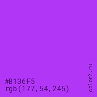Цвет #B136F5 в цветовой модели RGB обозначается тремя октетами (177, 54, 245) в десятичном формате и #B136F5 в шестнадцатиричном (hex) формате, которые являются интенсивностью красного 177 (hex B1), интенсивность зелёного 54 (hex 36) и интенсивность синего 245 (hex F5).