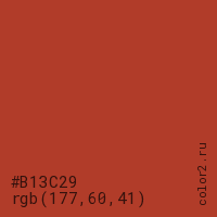 Цвет #B13C29 в цветовой модели RGB обозначается тремя октетами (177, 60, 41) в десятичном формате и #B13C29 в шестнадцатиричном (hex) формате, которые являются интенсивностью красного 177 (hex B1), интенсивность зелёного 60 (hex 3C) и интенсивность синего 41 (hex 29).