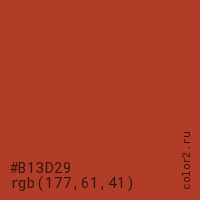 Цвет #B13D29 в цветовой модели RGB обозначается тремя октетами (177, 61, 41) в десятичном формате и #B13D29 в шестнадцатиричном (hex) формате, которые являются интенсивностью красного 177 (hex B1), интенсивность зелёного 61 (hex 3D) и интенсивность синего 41 (hex 29).